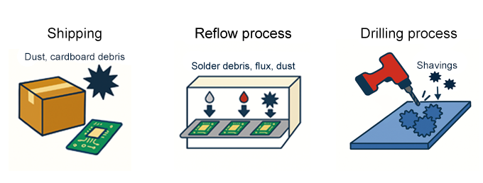 在制造电子电路板和各种零件的过程中,可能会因在制造过程中附着或混入异物而发生故障。例如,在回流焊接过程中,环境中的灰尘、碎屑、焊料或助焊剂等飞沫可能会附着在部件或电路板上,在电路板上钻孔时可能会附着切屑或残留清洁水。此外,运输过程中可能会附着或混入包装材料或缓冲材料的碎屑等灰尘。