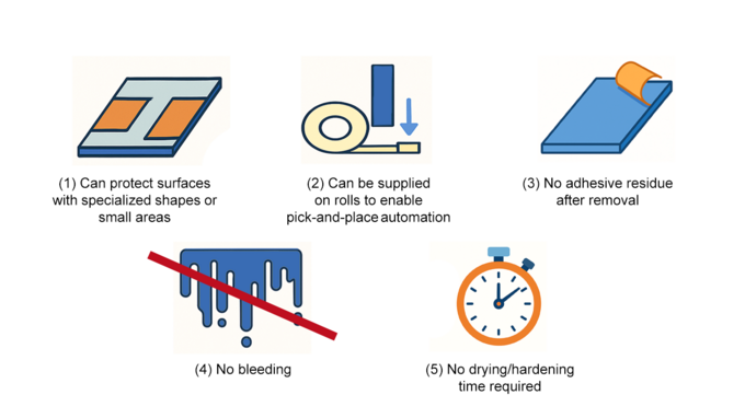本公司的工业用保护胶带,不像液体保护剂那样需要调整分配器等,只要贴上就能实现保护。此外,由于可以剥离而不会留下胶水,因此无需清洁过程,可以实现简单的制造过程。