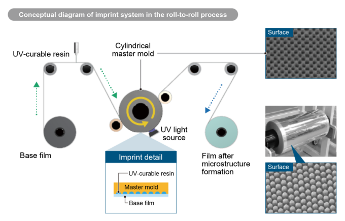 In roll-to-roll UV imprinting, UV-curable resin is first applied to the surface of the base film supplied from a roll. As the film passes through the cylindrical master mold, the resin-coated surface is brought into contact with the mold, and ultraviolet (UV) light is simultaneously irradiated to cure the resin. After curing, the microstructure pattern formed on the master mold is transferred onto the film surface, and the processed film is then rewound as a finished product.