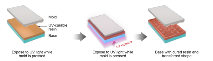 In UV imprinting, which uses ultraviolet (UV) light, UV-curable resin is applied to the base material, and the mold is pressed against the resin while it is exposed to UV light.